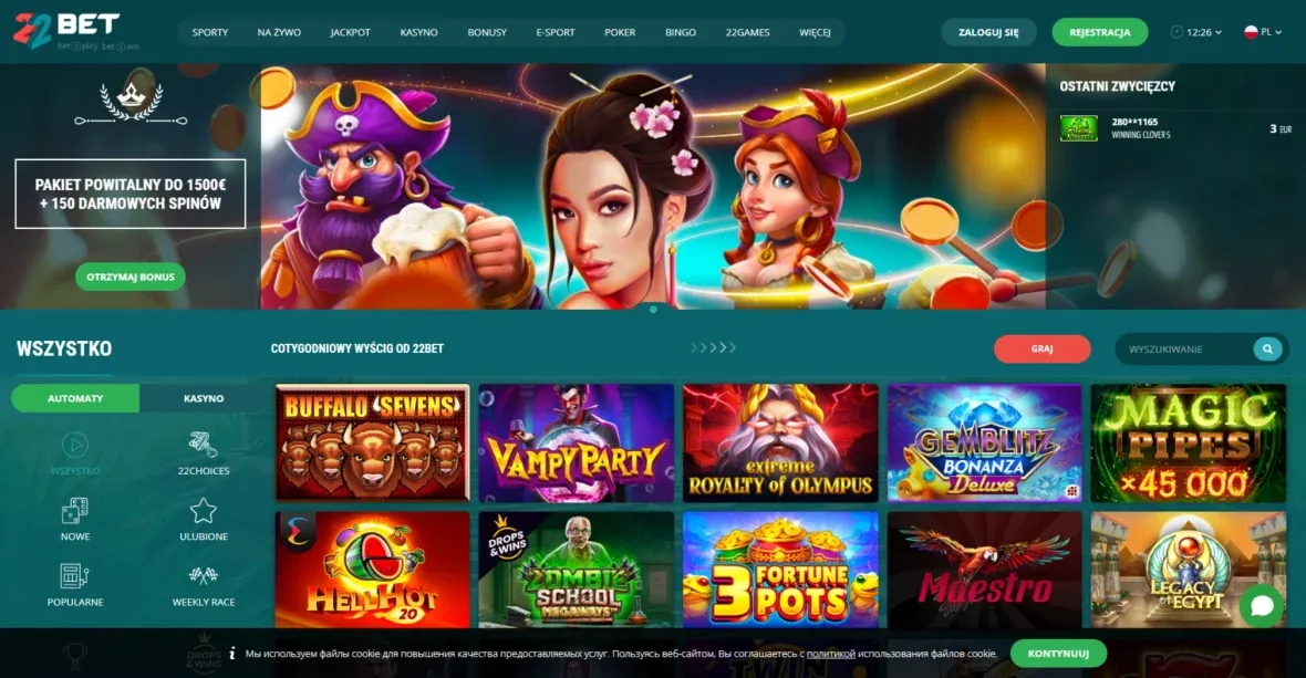 22Bet to rozmach. Ponad 5 000 gier, największa biblioteka w tym zestawieniu. Evolution i Ezugi przy stołach live. Konto multiwalutowe: PLN, EUR, Bitcoin, Ethereum. To jedno z nowych kasyn online Polska, które bardzo szybko zyskało renomę dzięki szerokości oferty i sprawnym wypłatom. Bonusy reload co tydzień, misje z nagrodami, wypłaty w 1 do 12 godzin.